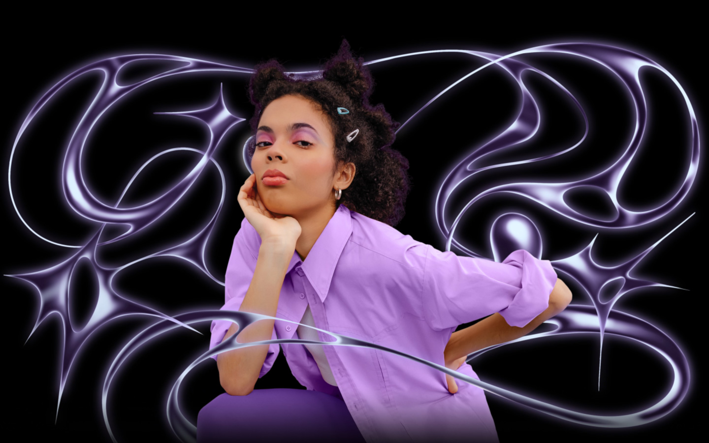 iPad and Mac devices, workspace with image of person with two hair clips and wearing a purple collared shirt, stylized background, Layers panel on the side of both screens
