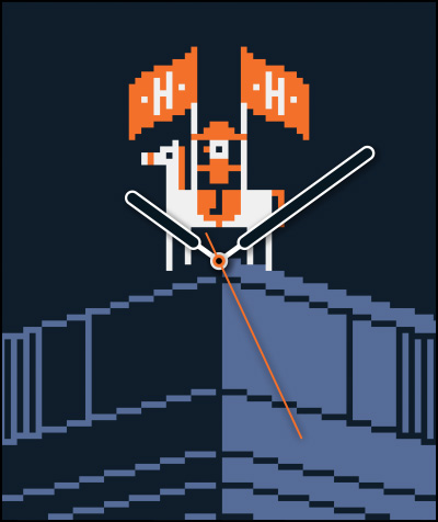 Pixel art of a person and horse sitting at a table, available Apple Watch Hermès bands in varying styles and colors