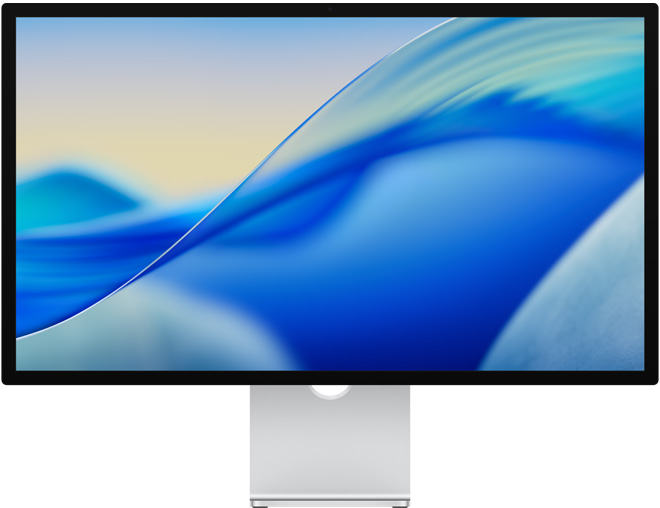 Vue avant du Studio Display avec un fond d’écran coloré évoquant un ruban Des formes colorées évoquant des rubans remplissent l’écran : un zoom arrière révèle qu’il s’agit du fond d’écran d’un Studio Display