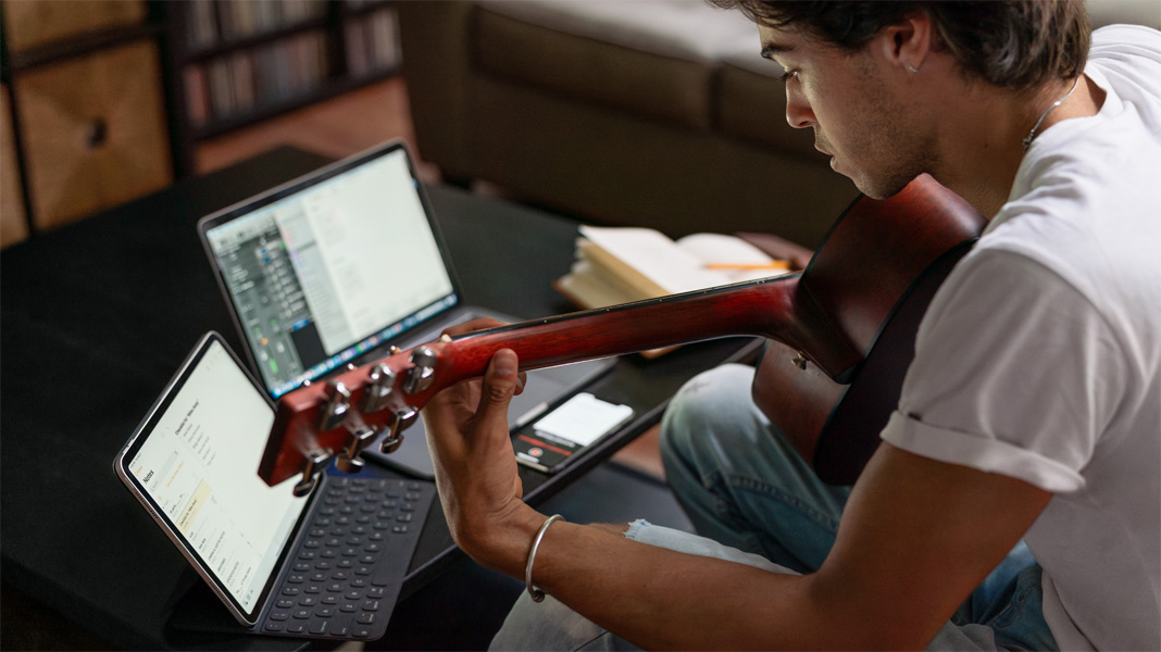 Al igual que otros estudiantes, Max tuvo que adaptarse al aprendizaje remoto, lo cual hizo que su MacBook Pro fuera más importante que nunca. Con software de producción profesional como Logic Pro, el MacBook Pro es el compañero perfecto y tiene todo lo que necesita para transformar su habitación en un estudio de grabación.