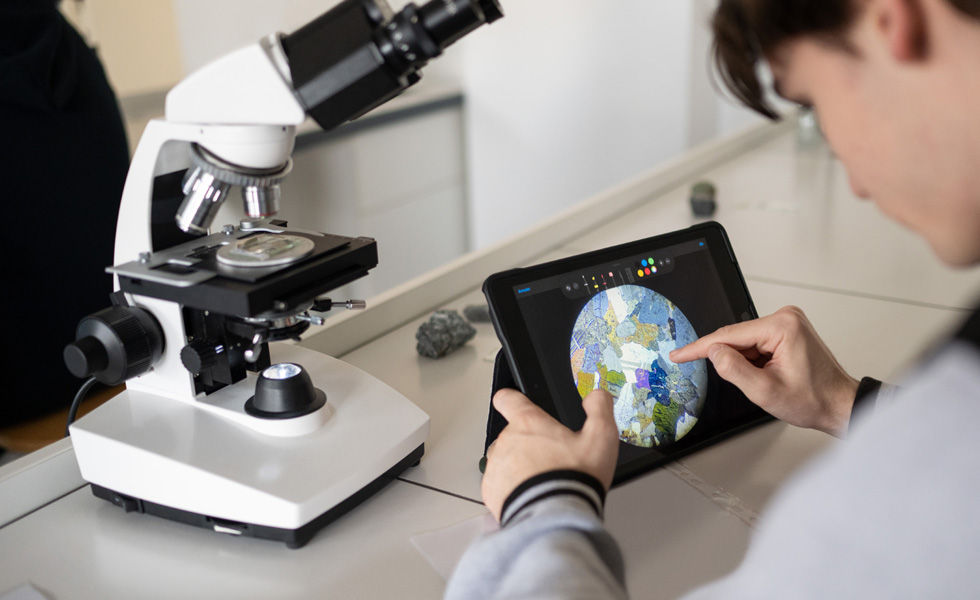 En las clases de ciencias, las funcionalidades y apps integradas del iPad ponen al alcance de los estudiantes todas las herramientas de aprendizaje que necesitan en un solo dispositivo. Por ejemplo, en la clase de biología de la profesora Sophie Padilla, los estudiantes usan la Cámara para tomar fotos de las células que observan a través del microscopio y luego editan las imágenes en Keynote, donde además agregan notas de sus hallazgos. Y en la clase de física de Stéphane Calvo, los estudiantes analizan el movimiento de objetos rodantes, registran los datos en Numbers y crean gráficos con facilidad para identificar patrones en sus resultados.