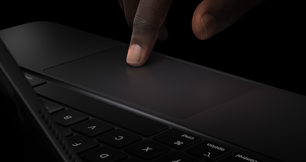 Das Magic Keyboard hat ein elegantes, mobiles Design mit einer Handauflage aus Aluminium und bietet ein fantastisches Tipp‑ und Trackpad-Erlebnis.12 Die Tastatur verfügt über eine Reihe mit Funktionstasten und ein größeres Trackpad aus Glas mit haptischem Feedback für präzises Arbeiten und Multi-Touch Gesten.