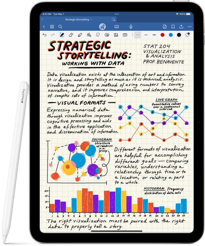 Apple Pencil paneb paika, kuidas joonistamine, märkmete tegemine ja dokumentide märgistamine peaks tunduma – vaistlik, täpne ja maagiline. Apple Pencilit, mille eelisteks on pikslitäpsus, väike latentsusaeg, kaldetundlikkus ning võimalus oma kätt töötades ekraanile toetada, on uskumatult lihtne kasutada alati, kui inspiratsioon peale tuleb.