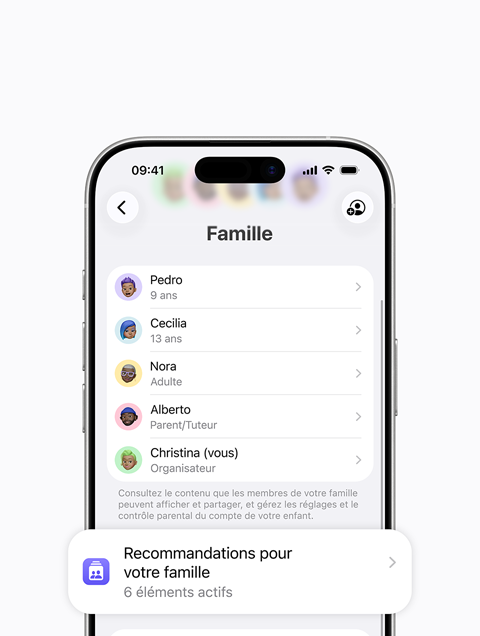 Découvrez nos conseils et nos idées d’utilisation des fonctionnalités familiales. Ouvrez Réglages, touchez votre nom, Famille, puis Recommandations pour votre famille.