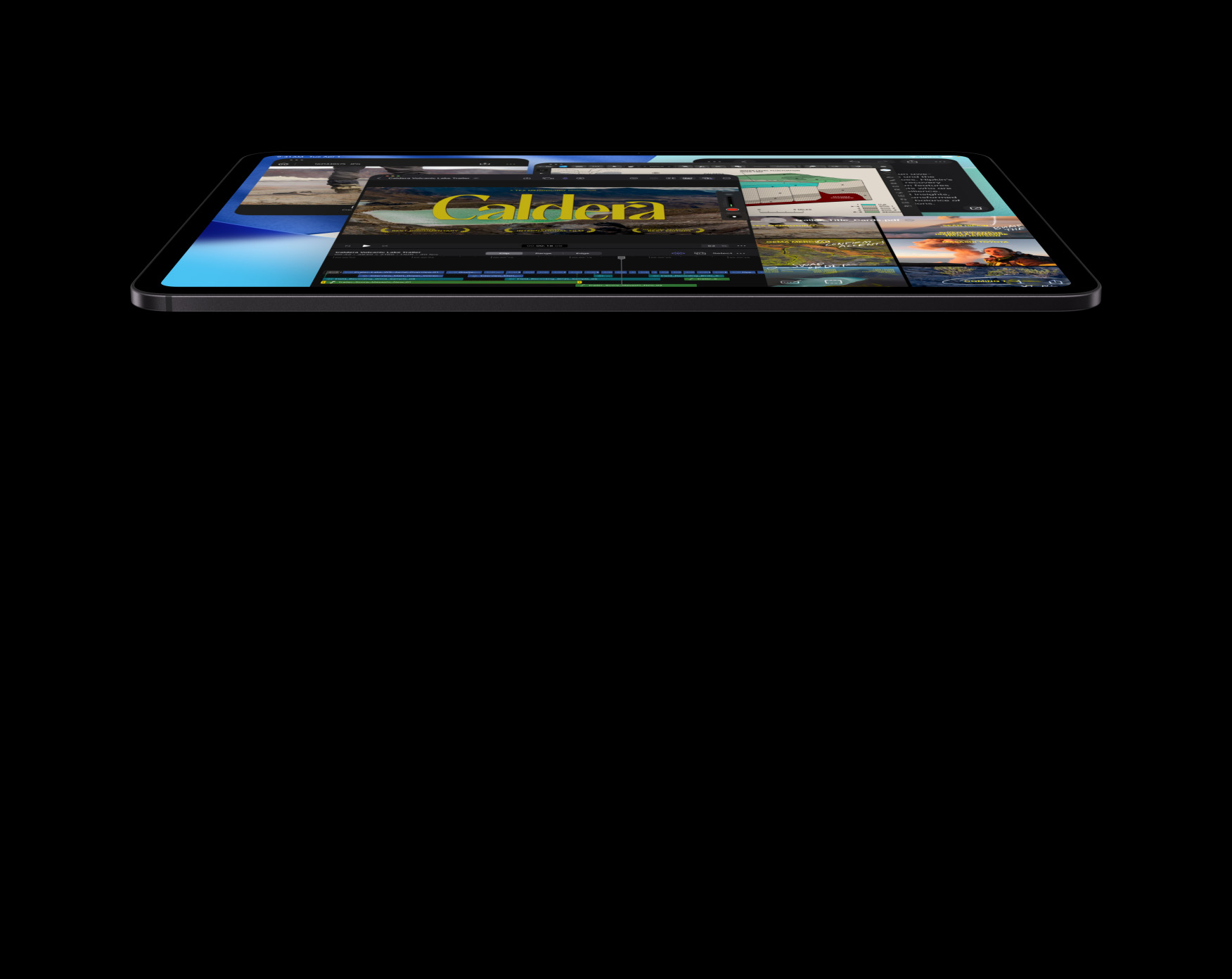 iPad Pro, front exterior, landscape orientation, space black color, attached to Magic Keyboard, space black, display with multiple app windows: Final Cut Pro with multiple video editing features and timeline, Maps, Notes, media clips