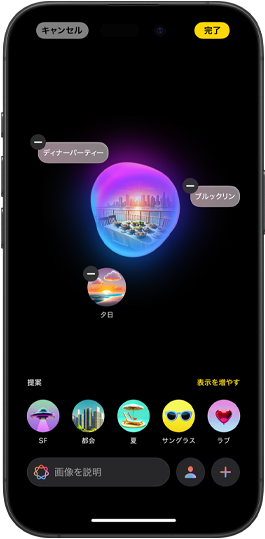 Image Playgroundを使って、楽しく遊び心あふれる画像を作成しましょう。メッセージやフリーボードなどのアプリ内、またはImage Playground専用のアプリからどうぞ。アニメーション、イラスト、スケッチのほか、ChatGPTのまったく新しいスタイルから選べます。写真ライブラリ内の家族や友だちをモデルにした画像では、ひげや表情などをカスタマイズすることもできます。