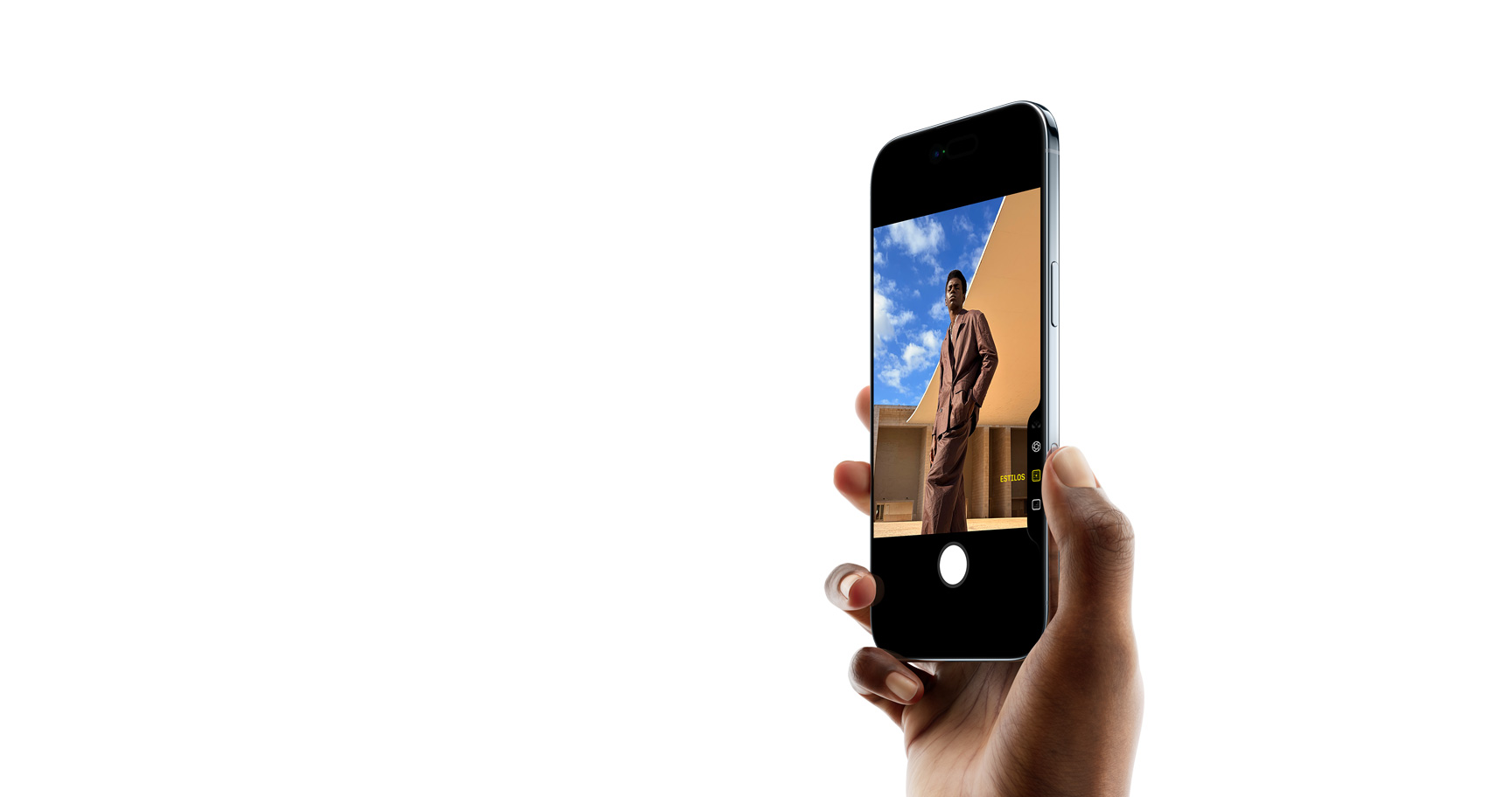 Una mano sostiene un iPhone Air, parte frontal, parte lateral, color azul cielo, perfil muy delgado, Dynamic Island, botones: lateral, Control de la Cámara