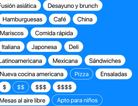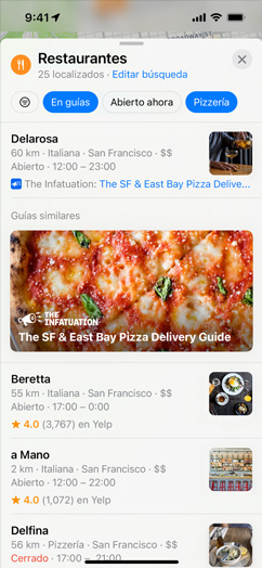 En Mapas es rápido y sencillo encontrar lo que buscas. Usa los filtros ultraespecíficos para buscar restaurantes por especialidad, rango de precios o con opción de comida para llevar. O elige ver sólo los lugares que estén abiertos en ese momento. ¿Quieres ampliar tu búsqueda? Sólo tienes que mover el mapa y los resultados se actualizarán automáticamente. Los sitios aparecen en el mapa con distintivos de diferentes colores, para que puedas localizarlos más rápidamente.