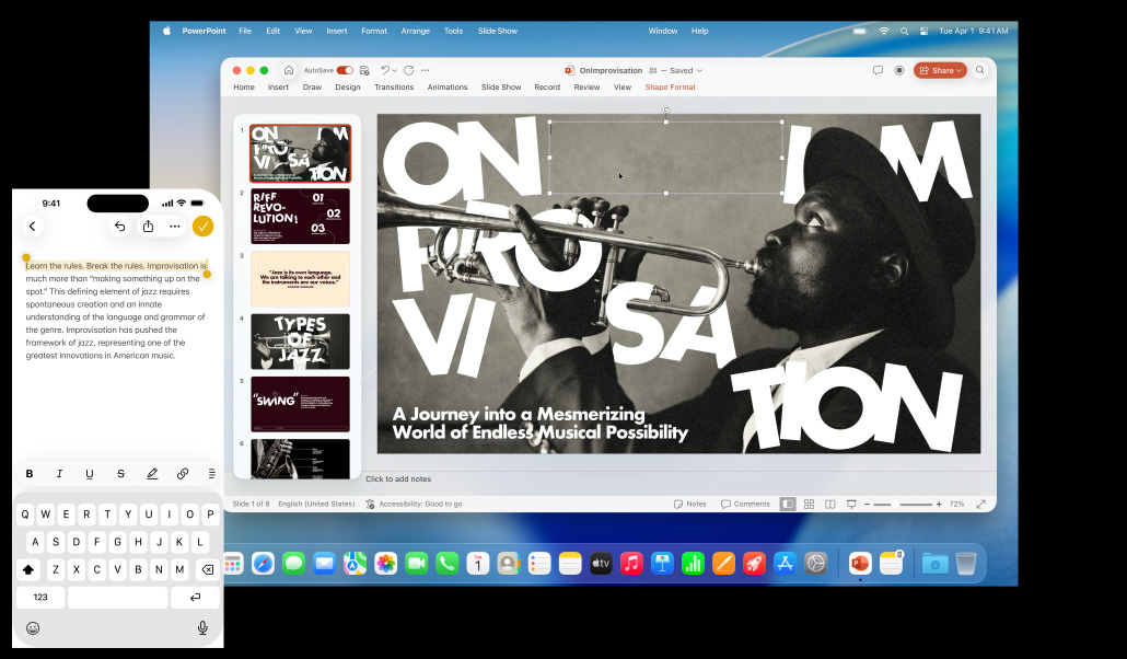 iPhone 16 Plus with text highlighted in the Notes app, 13-inch Macbook Air with a Keynote slide open, text from Notes app is visible on the slide