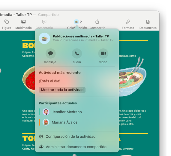 Colabora y comparte fácilmente archivos, carpetas, documentos y mucho más aunque estés del tingo al tango. Sólo tienes que enviar un enlace privado y configurar los ajustes si quieres que los demás vean, compartan o editen el contenido. Y gracias a las actualizaciones en vivo, podrás ver las modificaciones que se vayan haciendo en tiempo real.