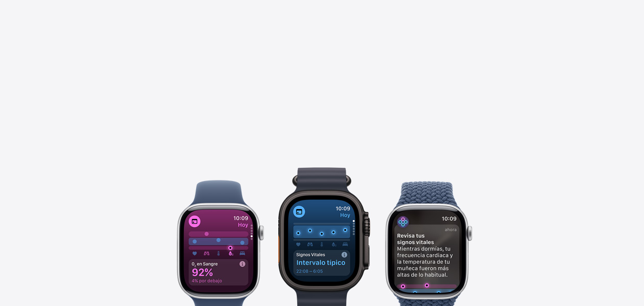 Obtén un panorama más completo de tu estado de salud diario desde tu muñeca. Usa el Apple Watch mientras duermes para llevar un registro de tus signos vitales nocturnos, como frecuencia cardiaca promedio, frecuencia respiratoria, oxígeno en la sangre y temperatura de la muñeca. Recibe notificaciones si alguno de esos parámetros está fuera de tus intervalos típicos.