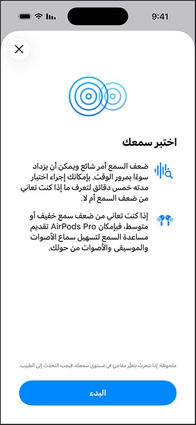 استفد من اختبار السمع1 ووسيلة مساعدة السمع1 وميزة حماية السمع النشطة2 باستخدام AirPods Pro 3 أو AirPods Pro 2 مع iPhone أو iPad فقط. إنها أول تجربة متكاملة في العالم لصحة السمع.