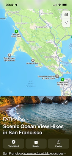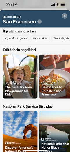 • Özel Düzenlenmiş Rehberler, yemek yemek, alışveriş yapmak, arkadaşlarla buluşmak veya sadece keşfetmek için harika yerler bulmanıza yardımcı olmak amacıyla güvenilir iş ortakları tarafından hazırlanan yer listeleridir. Harita’da dünya çapında birçok şehir için 1000’den fazla özel düzenlenmiş rehber sunulmaktadır. iOS 15’te Harita’yı açıp Rehberleri Keşfet’e dokunarak Harita editörlerinin tavsiye ettiği Rehberler'i inceleyebilirsiniz.