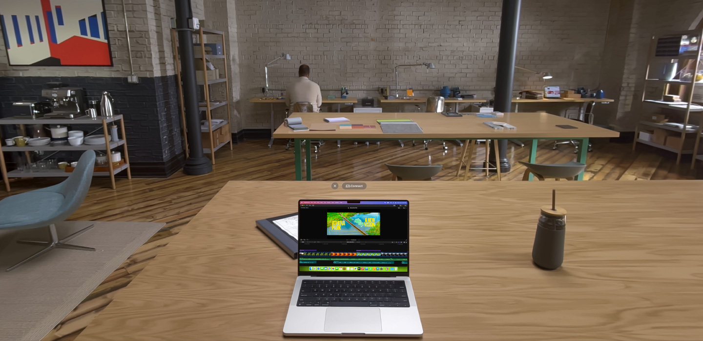 Apple Vision Pro 創造的工作空間,有如讓你隨身攜帶強大的筆記型電腦和超廣角螢幕,無論在辦公室或通勤中都好用。而使用 Mac 虛擬顯示器時,你的空間就會延伸為無邊際的畫布,各款 macOS 和 visionOS app 隨你使用。