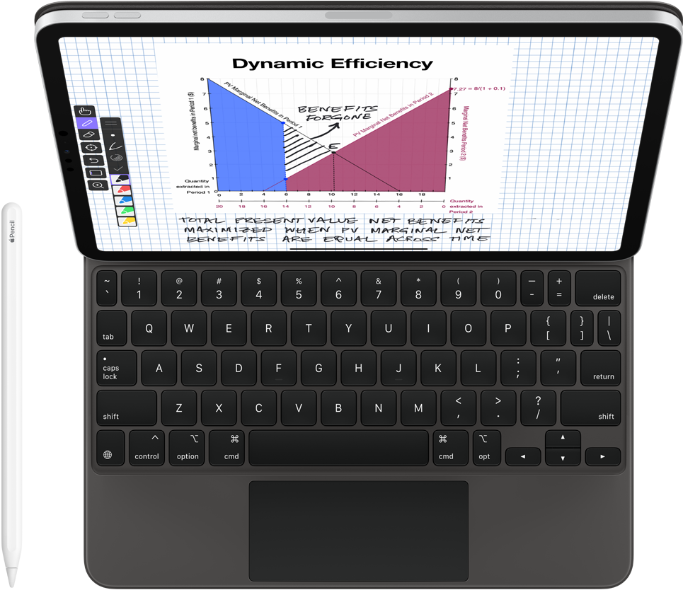 iPad Pro và Apple Pencil. Tiến Sĩ Gopalakrishnan sử dụng Explain Everything Whiteboard trên iPad để ghi lại và lưu trữ các bài học kinh tế môi trường của mình, chia nhỏ các biểu đồ và đồ thị trừu tượng, đồng thời chỉ cho sinh viên cách giải các bài toán phức tạp trong thời gian thực.