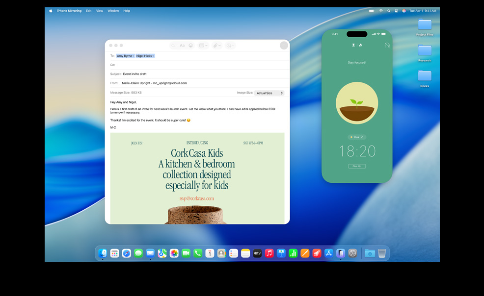 Tính năng Phản Chiếu iPhone cho phép bạn xem và sử dụng iPhone ngay từ máy Mac.5 Nên dù điện thoại đang sạc trong phòng, bạn vẫn có thể truy cập tất cả ứng dụng iPhone yêu thích của mình. Thậm chí, bạn có thể kéo và thả một video từ ứng dụng Ảnh trên iPhone lên ngay màn hình nền máy Mac. Hoạt Động Trực Tiếp từ iPhone cũng xuất hiện trên máy Mac. Vậy nên khi có các sự kiện cần xử lý kịp thời, bạn không phải lấy điện thoại để cập nhật thông tin.